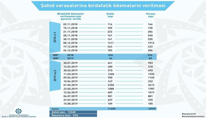 Ümumilikdə 12 268 şəhidin vərəsələrinin birdəfəlik ödəmə almaq hüququ müəyyən edilib. Bu günədək onlardan artıq 11 403 şəhidin 16 949 vərəsəsinin birdəfəlik ödəmə ilə təminatına dair qərar qəbul olunub.