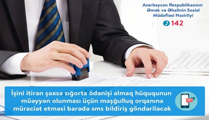 Müəssisənin ləğvi və ya işçilərin (yaxud ştatların) sayının ixtisar edilməsi nəticəsində əmək müqaviləsinə xitam verilən, yəni işini itirən şəxsə işsizlikdən sığorta ödənişi almaq hüququnun müəyyən olunması üçün müvafiq rayon (şəhər) Məşğulluq mərkəzinə müraciət etməsi barədə mobil telefonuna elektron qaydada sms bildiriş göndəriləcək.