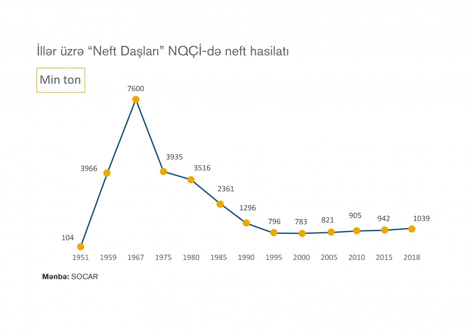 Ötən 70 il ərzində Neft Daşları böyük bir qəhrəmanlıq yolu keçərək nəhəng istehsal-yaşayış kompleksinə çevrilmişdir. Burada indiyədək 1939 quyu qazılmış, 200 kilometrdən çox estakada, 333 istehsal meydançası tikilmiş, 100 kilometrlərlə neft, qaz, su kəmərləri çəkilmiş, işlənmənin əvvəlindən 175,5 milyon ton neft və 14,3 milyard kubmetrdən çox qaz hasil olunmuşdur. Neft Daşları ona bitişik olan “Palçıq pilpiləsi” yatağı ilə birlikdə istismar dövründə Azərbaycanın neft hasilatının təqribən 13 faizini birbaşa təmin etmişdir. Hasilatının pik səviyyəsində - 1967-ci ildə Neft Daşlarında 7,6 milyon ton neft hasil olunmuşdur ki, bu da Azərbaycanın o dövrdə ümumi neft hasilatının 1/3 hissəsi idi. Hazırda Neft Daşlarında istismar fondunda olan 406 quyunun 399-u fəaliyyətdədir, yataq üzrə gündəlik hasilat 3050 ton neft, 300 min kubmetr qaz təşkil edir. Sulaşma göstəricisi 30 faiz təşkil edir ki, bu da işlənmənin son mərhələsində olan yataq üçün kiçik göstəricidir.