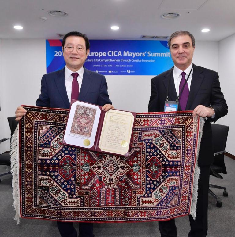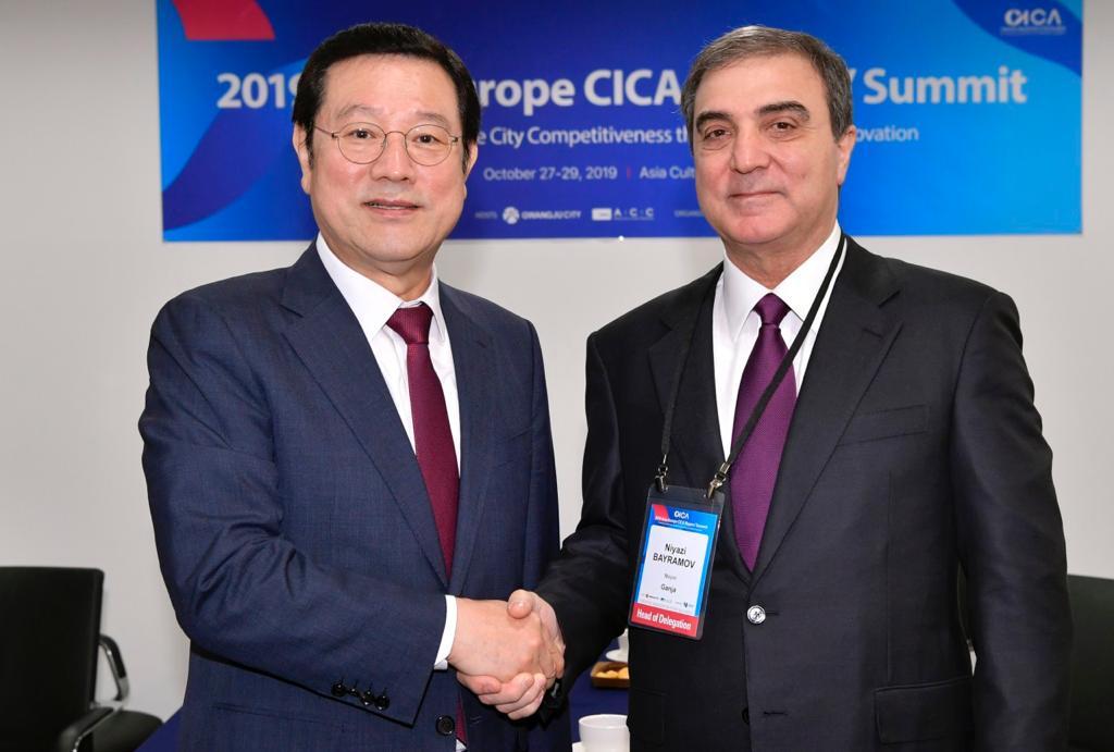Gəncə Şəhər İcra Hakimiyyətinin başçıs Niyazi Bayramovun başçılıq etdiyi nümayəndə heyəti Cənubi Koreyanın Qvanqju şəhərində keçirilən “2019 - CICA şəhər merlərərinin Zirvə Toplantısı”nda iştirak edir. “Kreativ, innovativ şəhər inşa etməkdə yerli icra strukturlarının rolu” mövzusunda təşkil olunan Zirvə Toplantısında Avropa və Asiyanın 15 müxtəlif şəhərindən dəvət olunmuş nümayəndə heyətləri, Azərbaycanın Cənubi Koreyadakı Fövqəladə və səlahiyyətli səfiri Rəmzi Teymurov, səfirliyin əməkdaşları yer alıblar.