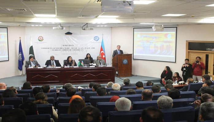 Səfirlikdən Trend-ə verilən məlumata görə, Pakistanın əyalətlərarası koordinasiya üzrə federal naziri, Pakistan Milli Assambleyasının sabiq sədri xanım Fehmida Mirzənin ali qonaq kimi təşrif buyurduğu “Münaqişələr, soyqırımlar, müharibələr – Bir daha olmasın. Etimadla Sülh və Sabitlik” mövzusundakı seminarda Milli Elmlər və Texnologiya Universitetinin rektoru, ehtiyatda olan general-leytenant Navid Zaman, Pakistan XİN-nin nəznində olan İslamabad Strateji Tədqiqatlar İnstitutunun direktoru, Azərbaycan-Pakistan Dostluq Cəmiyyətinin sədri, sabiq səfir Xalid Mahmud, bir sıra ölkələrin səfirləri, yüksək rütbəli diplomatları, media mənsubları, gənclər və universitet tələbələri, tədqiqatçılar və ictimaiyyətin nümayəndələri iştirak ediblər.