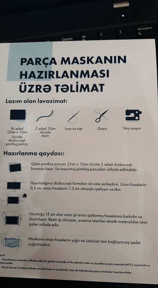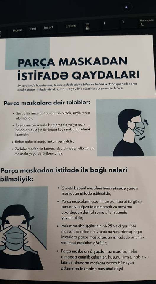- Həkim və tibb işçilərinin N-95 və digər tibbi maskalara artan ehtiyacı nəzərə alaraq digər insanlara parça maskalardan istifadədə üstünlük verilməsi məsləhət görülür;