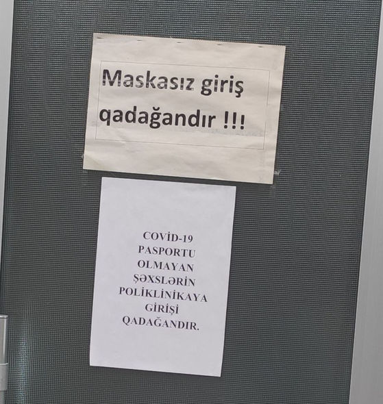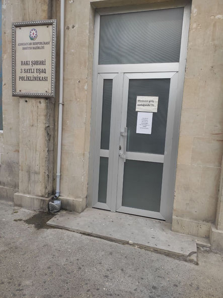 Bakı şəhərində fəaliyyət göstərən 3 saylı uşaq poliklinikasının qapısına COVID-19 pasportu olmadan girişin qadağan olunması ilə əlaqədar elan yerləşdirilib.