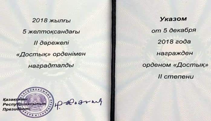Dekabrın 16-sı Qazaxıstanın müstəqilliyinin 27-ci ildönümü günüdür. Bu bayram münasibətilə ölkənin sosial, iqtisadi və mədəni inkişafına, xalqlar arasında dostluq və əməkdaşlığın güclənməsinə böyük töhfə verilməsində göstərdikləri xidmətlərə görə müxtəlif sahələrdə çalışanlar mükafatlandırılıb.