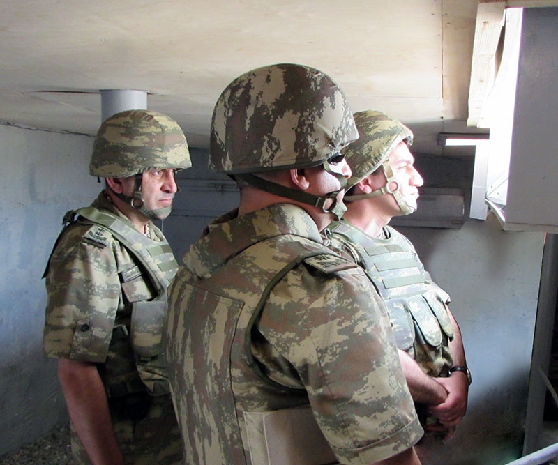 Düşmənlə üzbəüz yüksək dağlıq şəraitdə döyüş növbətçiliyi aparan şəxsi heyətin xidməti ilə maraqlanan H.Hacıyev komanda-müşahidə məntəqəsindən düşmən mövqelərini müşahidə edib.