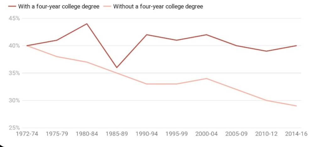 Alimlər respondentləri maddi rifahı, təhsil səviyyələrini və dəri rənglərini nəzərə alaraq bir neçə qrupa ayırıblar. 1970-ci illərdə fərqli təhsil səviyyələri olan ağ dərili amerikalılar çox xoşbəxt olduqlarını bildirib. Onlar 40 % təşkil edir . Ancaq 2010-cu ildə bir boşluq yaranıb: ali təhsili olmayan "çox xoşbəxt" insanların sayı tədqiqat boyunca aşağı enirdi və 2016-cı ildə cəmi 29% oldu.