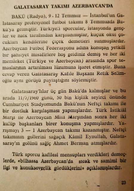 Jurnalist Dilqəm Əhməd sosial şəbəkə hesabında Türkiyənin “Qalatasaray” klubunun 1960-cı ildə Bakıda “Neftçi” ilə keçirdiyi yoldaşlıq oyunu ilə bağlı arxiv bir material paylaşıb. Materialda Türkiyə mətbuatında oyuna həsr olunmuş reportaj yer alıb. Görüş 3:1 hesabı ilə “Neftçi”nin xeyrinə başa çatıb. Reportajda Bakı komandasının qollarını Kamil Eynullayevin (arxiv materialda “Kamil Eynullah” kimi qeyd olunub) vurduğu yazılıb.