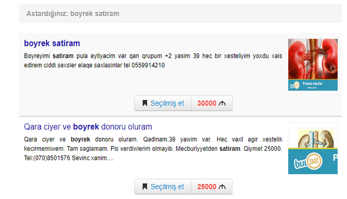Böyrək satışında qiymətlər isə 30-45 min manat aralığında dəyisir və hətta razılaşma yolu ilə satanlar da var. Qaraciyərini satmaq istəyənlər isə onu 25 min manata təklif edirlər.