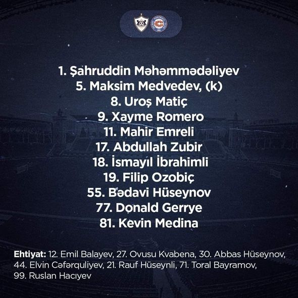Ehtiyat oyunçular: 12. Emil Balayev, 21. Rauf Hüseynli, 27. Ovusu Kvabena, 30. Abbas Hüseynov, 44. Elvin Cəfərquliyev, 71. Tural Bayramov, 99. Ruslan Hacıyev