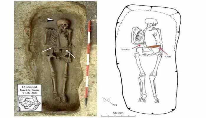 Bundan başqa skeletin üzərində bir ucu amputasiya olunmuş əlin yanında yerləşən uzun bıçaq tapılıb. Alimlər bunun protezin bir detalı olduğunu düşünür, belə ki, nekropolda olan digər kişi skeletlərində silah hər zaman sümüklərdən bir qədər aralıda yerləşib.