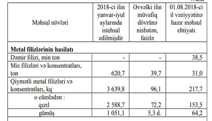 2018-ci ilin iyul ayında Azərbaycanda 192,6 kq qızıl hasil olunub.