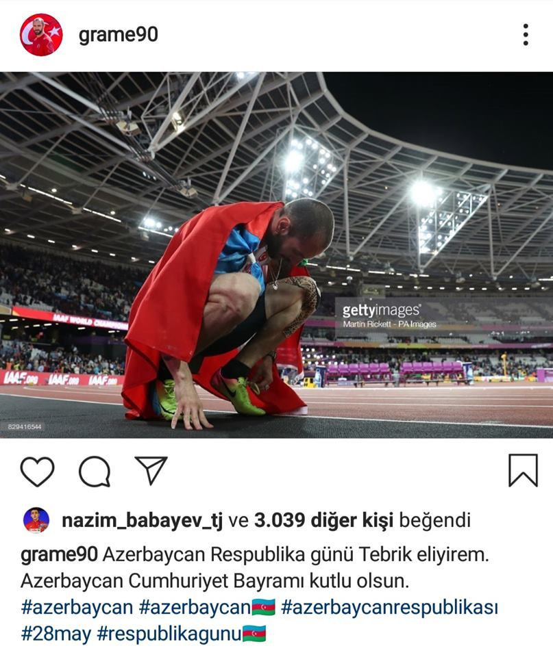 Ens.az "Report"-a istinadən xəbər verir ki, 30 yaşlı idmançı Azərbaycan və türk dilində təbriklərini çatdırıb.