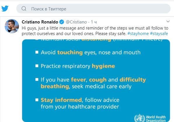 Turin "Yuventus”unun və Portuqaliya milli komandasının futbolçusu Kriştianu Ronaldu özünün "Twitter"dəki səhifəsində izləyicilərinə koronavirusun (COVID-19) yayılmasının qarşısının alınması üçün qaydalara əməl etmələrini xahiş edib.