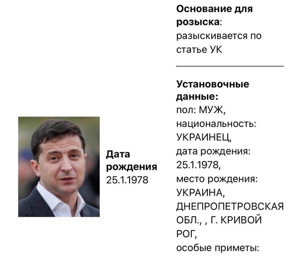 Ens.az Oxu.az-a istinadən xəbər verir ki,Rusiya Daxili İşlər Nazirliyi Ukrayna Prezidenti Volodimir Zelenski axtarışa verib.