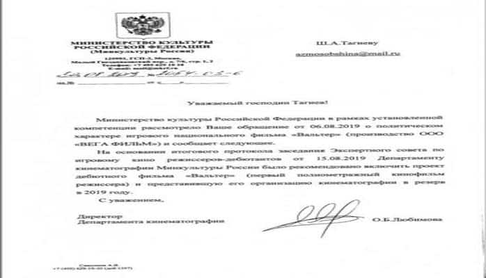 Bu barədə APA-nın Rusiya bürosuna Moskvadakı Azərbaycan İcmasının sədri Şamil Tağıyev məlumat verib. Onun sözlərinə görə, avqustun 6-da onun tərəfindən Rusiyanın Mədəniyyət naziri Vladimir Medinskiyə ünvanlanan müraciətə avqustun 30-da cavab verilib: "Mədəniyyət Nazirliyindən daxil olan məlumatda bildirilir ki, “Veqa film" şirkətinin "Valter" adlı filmində siyasi xarakter haqda müraciətlərə baxılıb. Rusiya Mədəniyyət Nazirliyinin Kinematoqrafiya Departamentinin Ekspertlər Şurasının iclasının 15.08.2019 tarixli yekun protokoluna əsasən, "Valter" filminin (rejissorun ilk tammetrajlı filmi) 2019-cu ilin rezervinə daxil edilməsi tövsiyə olunub".