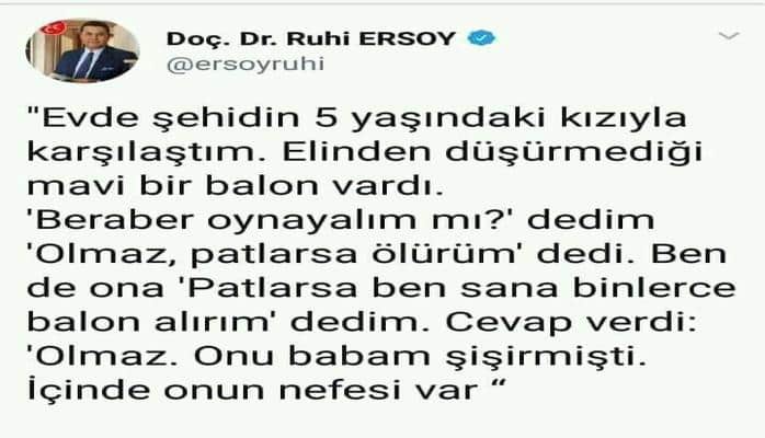 Bu günlərdə sosial şəbəkədə Türkiyə Böyük Millət Məclisinin sabiq millət vəkili, tanınmış siyasətçi Ruhi Ərsoyun şəhid qızı ilə diaoloqu diqqətimi çəkdi.