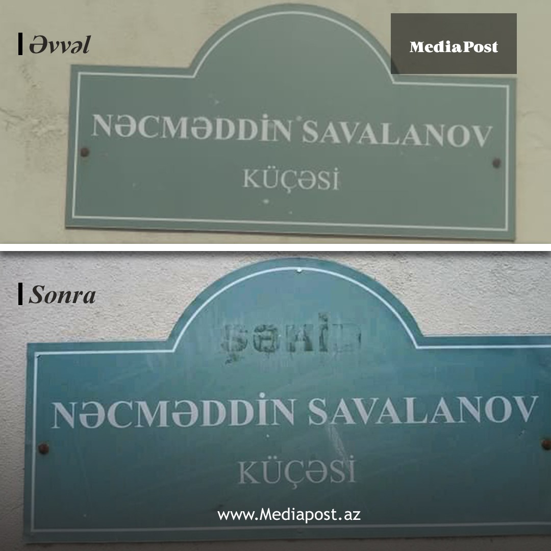 “Sadəcə kimsə həmin “şəhid” sözünü qələmlə sonradan yazıb. Ora əslində nömrə yeridir, “şəhid” sözü yerləşmir. Küçə boyu bütün lövhələrdə küçənin adı Nəcməddin Savalanov kimi qeyd edilib”.