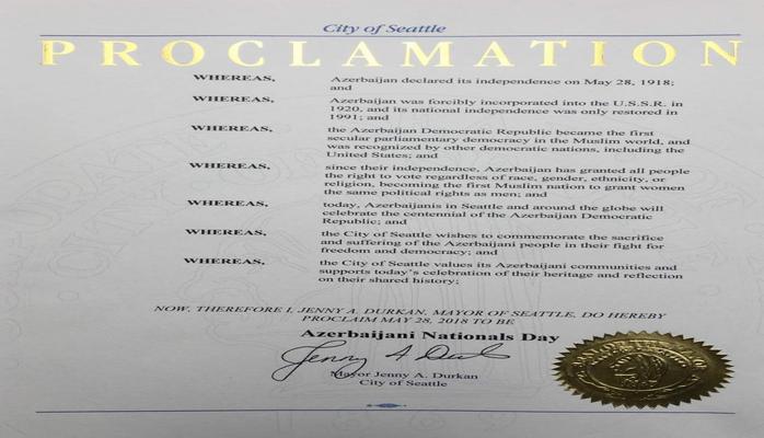 Qeyd etmək istərdik ki, bəyanat Sietl şəhərinin meri tərəfindən Sietlda yaşayan Azərbaycan icması və Vaşinqton Universitetinin Azərbaycanlı tələbələrinin dəstəyi nəticəsində təqdim olunub.