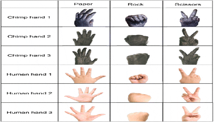İstənilən cins və yaşlı şimpanze “daş,qayçı,kağız” adlı sadə oyunu öyrənə bilir. Baxmayaraq ki, bu uzun müddət tələb edə bilər, heyvanlar balaca uşaq kimi oyunu öyrənməyə qadirdir.