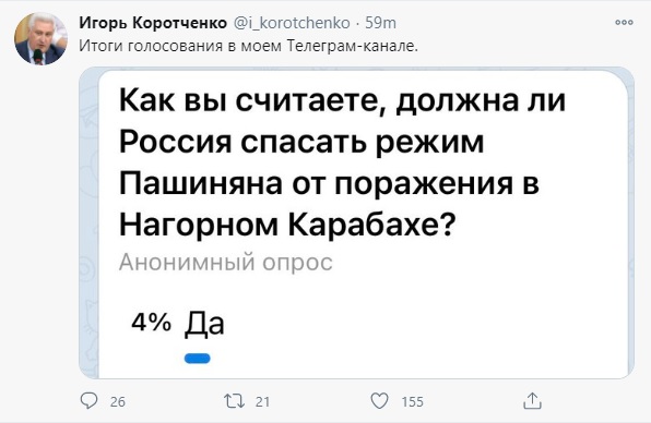 Belə ki, o, Azərbaycanın işğal altında olan torpaqları azad etmək üçün sentyabrın 27-dən başlayan əks-hücum əməliyyatlarında qələbələri fonunda kanal üzvlərinə “Rusiya hökuməti Paşinyan rejimini Dağlıq Qarabağda məğlubiyyətdən xilas etməlidirmi” sualı ilə müraciət edib.