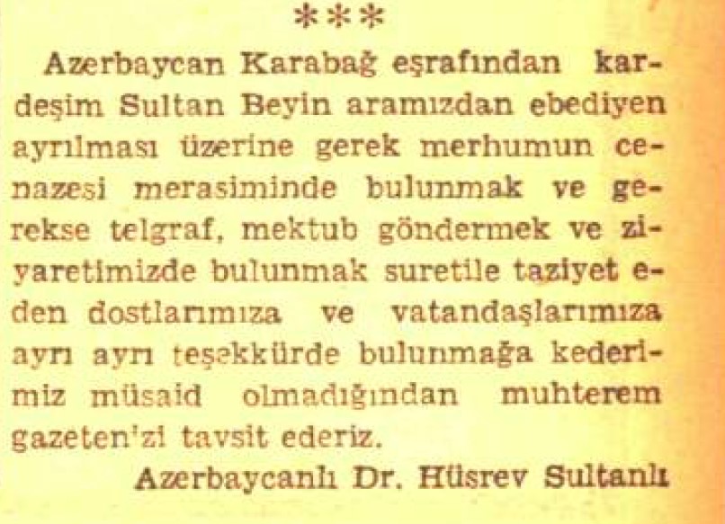 "Azərbaycanın Qarabağın tanınmış şəxsiyyətlərindən olan qardaşım Sultan Bəy aramızdan əbədiyyən ayrıldığı üçün mərhumun cənazəsi mərasimində iştirak edərək, teleqraf, məktub göndərərək və ziyarət edərək başsağlığı verən dostlarımıza və vətəndaşlarımıza ayrı-ayrılıqda təşəkkür etməyə kədərimiz səbəbilə vaxt tapmadığımız üçün möhtərəm qəzetinizi məsləhət görürük.