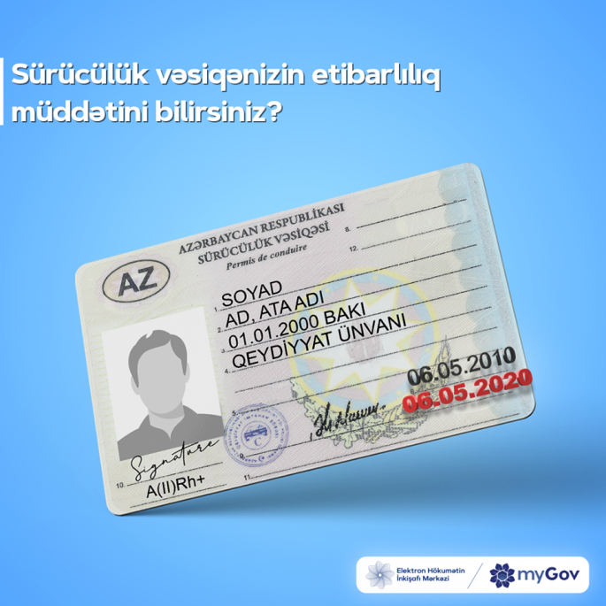 Bəzən sürücülər sürücülük vəsiqəsinin etibarlılıq müddətini unuda və yolda xoşagəlməz sürprizlə qarşılaşa bilər.Ens.az Avtosfer.az-a istinadən xəbər verir ki, lakin "myGov" portalında qeydiyyatdan keçməklə sürücülər özünü belə hallardan sığortalaya bilər. "myGov" portalında qeydiyyatdan keçdikdən sonra sürücülərə sürücülük vəsiqəsinin etibarlılıq müddəti haqqında aşağıdakı aralıqlarla bildirişlər göndəriləcək: