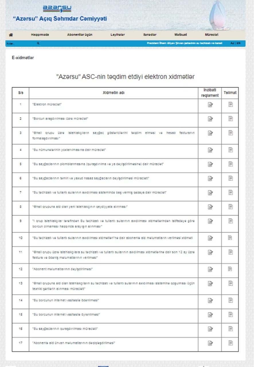 Qeyd edək ki, hazırda “Azərsu” ASC tərəfindən 17 adda elektron xidmət göstərilir. 2018-ci ildə bu xidmətlərdən istifadə ilə bağlı 345 min, 2019-cu ilin birinci rübündə isə 33 min müraciət qeydə alınıb.