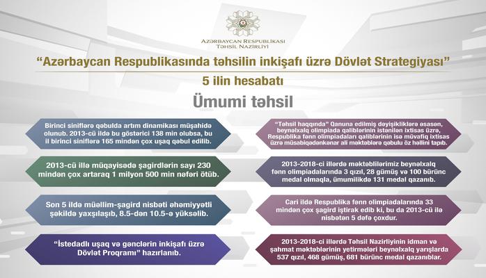 Ümumi təhsil üzrə məlumatlarda bildirilib ki, birinci siniflərə qəbulda artım dinamikası müşahidə olunub. 2013-cü ildə bu göstərici 138 min olubsa, bu il birinci siniflərə 165 mindən çox uşaq qəbul edilib. 2013-cü illə müqayisədə şagirdlərin sayı 230 mindən çox artaraq 1 milyon 500 min nəfəri ötüb. Son 5 ildə müəllim-şagird nisbəti əhəmiyyətli şəkildə yaxşılaşıb, 8.5-dən 10.5-ə yüksəlib. Cari ildə Respublika fənn olimpiadalarında 33 mindən çox şagird iştirak edib ki, bu da 2013-cü ilə nisbətən 5 dəfə çoxdur. 2013-2018-ci illərdə məktəblilərimiz beynəlxalq fənn olimpiadalarında 3 qızıl, 28 gümüş və 100 bürünc medal olmaqla, ümumilikdə 131 medal qazanıb. “İstedadlı uşaq və gənclərin inkişafı üzrə Dövlət Proqramı” hazırlanıb edilib. PIRLS beynəlxalq qiymətləndirməsinin nəticələrinə görə, azərbaycanlı şagirdlərin 2016-cı ildə oxu bacarıqları 2011-ci ilin müvafiq göstəricisi ilə müqayisədə 10 bal, “mükəmməl” və “yüksək” səviyyəyə uyğun nəticə göstərmiş şagirdlərin sayı 2 dəfə artıb. 2013-2018-ci illərdə Təhsil Nazirliyinin idman və şahmat məktəblərinin yetirmələri beynəlxalq yarışlarda 537 qızıl, 468 gümüş, 681 bürünc medal qazanıblar.