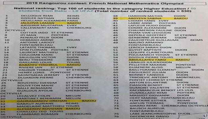 Hətta UFAZ tələbəsi Cəlilova Ləman riyaziyyat kateqoriyasında Fransa üzrə IV yeri qazanıb.