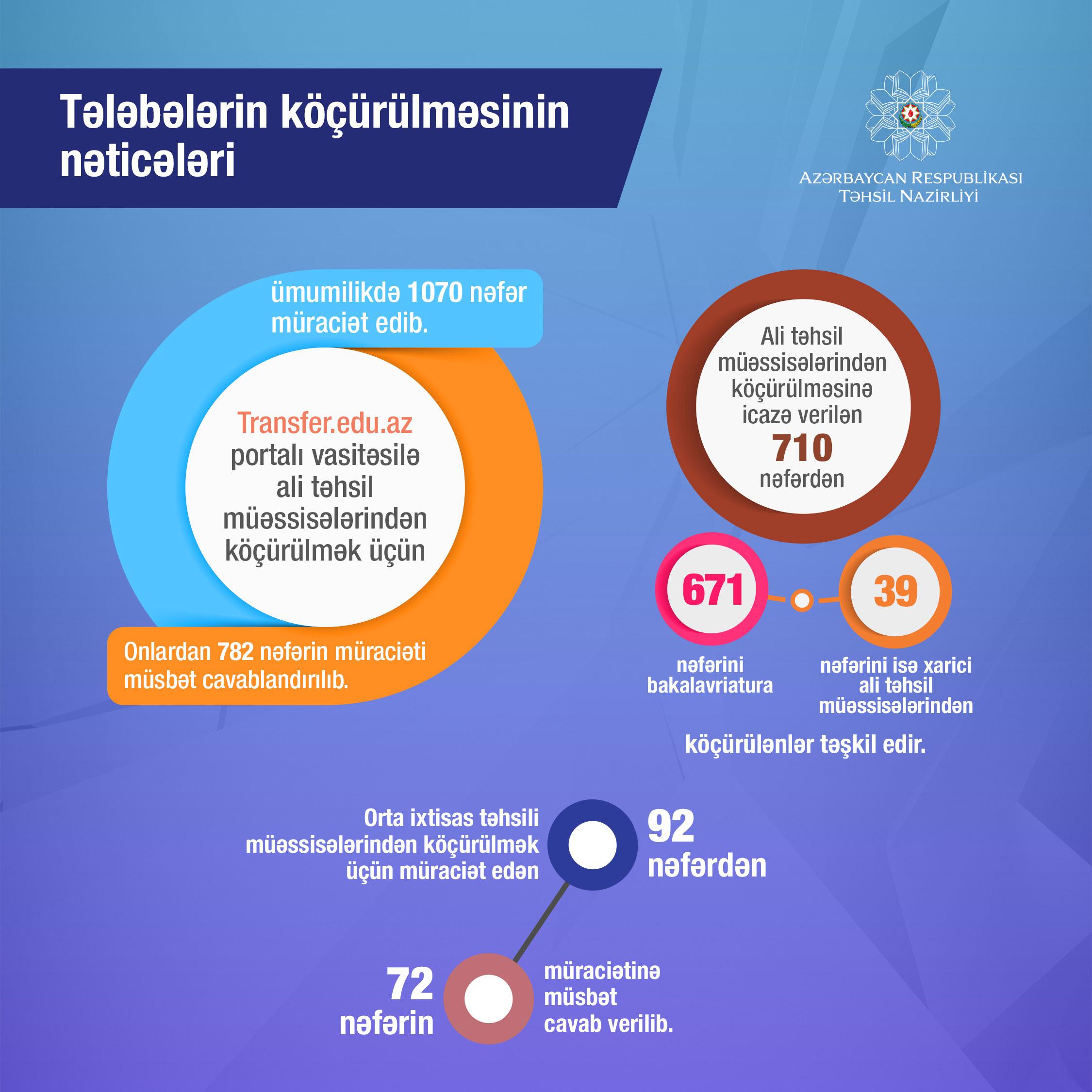 Ens.az xəbər verirki,təhsil Nazirliyindən "Report"a bildirilib ki, transfer.edu.az portalı vasitəsi ilə ali təhsil müəssisələrindən köçürülmək üçün ümumilikdə 1070 nəfər müraciət edib. Onlardan 782 nəfərinin müraciəti müsbət cavablandırılıb.
