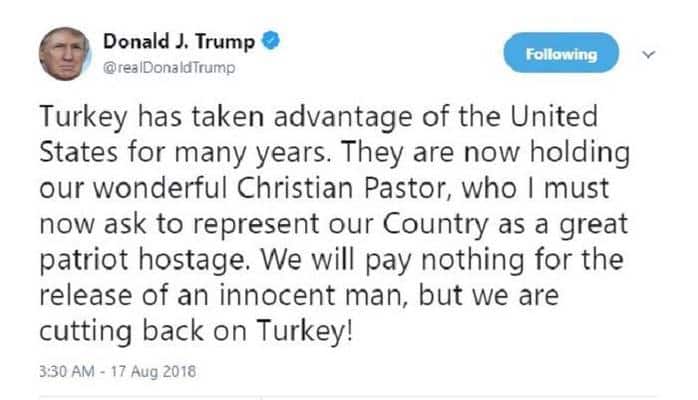 “Türkiyə uzun illər ABŞ-dan faydalanıb. İndi, ölkəmizi böyük bir vətənpərvər olaraq təmsil edən və möhtəşəm biri olan rahibi həbsdə saxlayırlar. Məsum bir adamın sərbəst buraxılması üçün heç bir şey ödəməyəcəyik. Türkiyə ilə əlaqələrimizi azaldacağıq”, - Tramp bildirib.