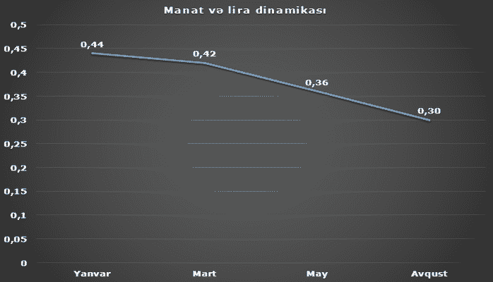 Ümumiyyətlə lirənin son günlərdə dəyər itirməsi manata da öz təsirini göstərib. Türkiyə lirəsi manat qarşısında yanvar ayı üzrə ən yüksək göstəricisi olan 0,46 qəpikdən 0,30 qəpiyə düşüb, bu isə 35% azalma deməkdir, başqa sözlə manat lirə qarşısında 35% yüksəlmişdir. 1 manat isə 3,79 türk lirəsidir. Bu göstərici yanvar ayında isə ən az 2,20 türk lirəsi idi. Yəni lira manat qarşısında 42% azalıb.
