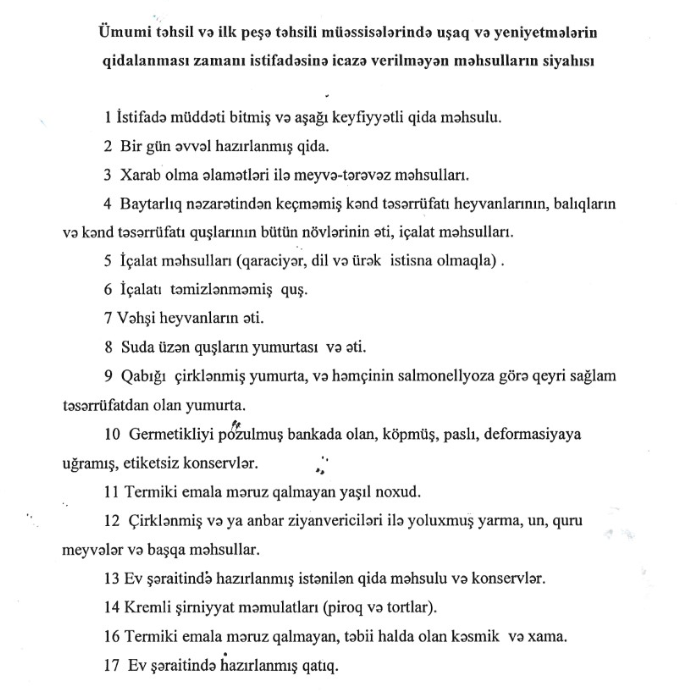 Bakı Şəhər Təhsil İdarəsindən “Qafqazinfo”nun sorğusuna cavab olaraq bildirilib ki, hazırda məktəb yaşlı uşaqların qidalanma təhlükəsizliyi prioritet məsələlərdəndir. Odur ki, kremli şirniyyat məmulatları (piroq və tortlar), ev şəraitində hazırlanmış qatıq, göbələk və ondan hazırlanan məhsullar, saqqız, çips, qayğanaq və energetik içkilərin ümumi təhsil və peşə təhsili müəssisələrində uşaq və yeniyetmələrin qidalanması zamanı istifadəsi qadağandır: