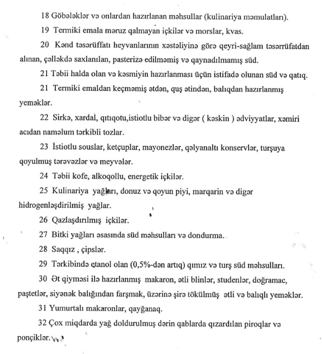 Son olaraq, ümumi təhsil müəssisələrinin bufet və yeməkxanalarında satışı qadağan olunmuş məhsulların siyahısını təqdim edirik: