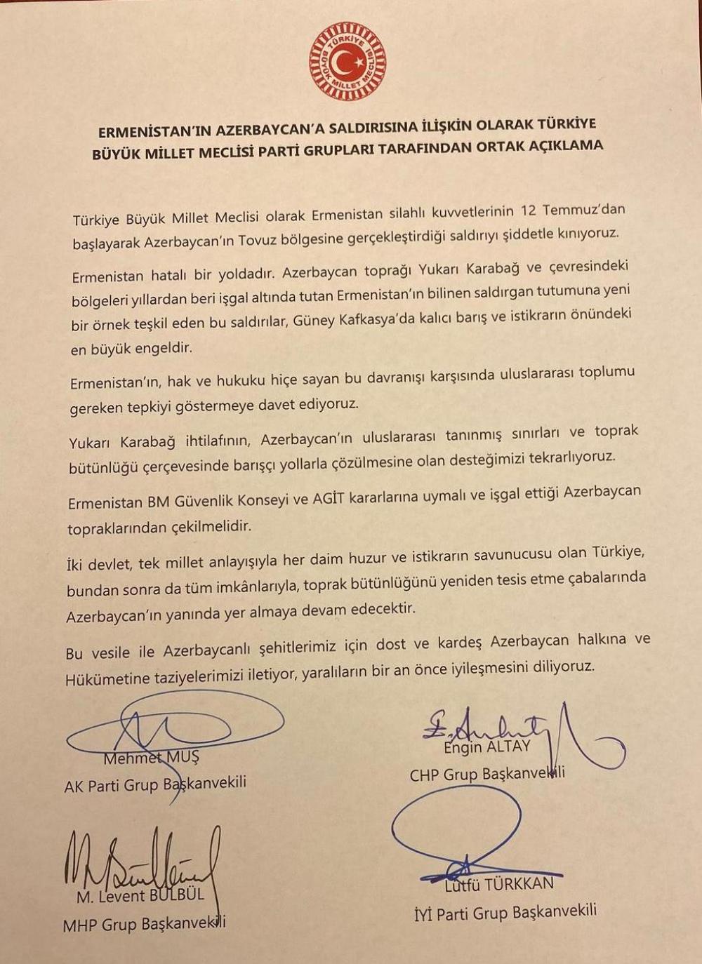 "Ermənistan Silahlı Qüvvələrinin Azərbaycanın Tovuz bölgəsi tərəfindən avqustun 12-dən başlayaraq şiddətli şəkildə hücuma keçməsini Türkiyə Böyük Millət Məclisi olaraq qətiyyətlə pisləyirik."