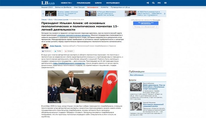 Azərbaycanın Ukraynadakı səfiri Azər Xudiyevin Ukraynanın nüfuzlu “lb.ua” saytında Prezident İlham Əliyevin 15 illik fəaliyyətinin uğurlarından bəhs edən geniş məqaləsi dərc olunub.