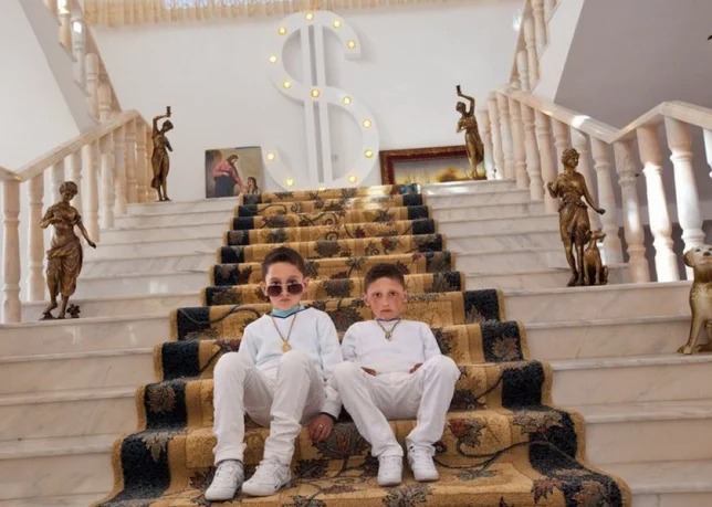 "Aşağıdakı şəkildə göstərilən altı yaşlı əkizlər Qelu və Edi Petraçe Pasxa bazar günü bayramının başlamasını gözləyirlər. Onlar, Buzesku şəhərində tikilən yüzlərlə qəribə evdən birində yaşayırlar. Divardakı nəhəng dollar işarəsinə diqqət yetirin."