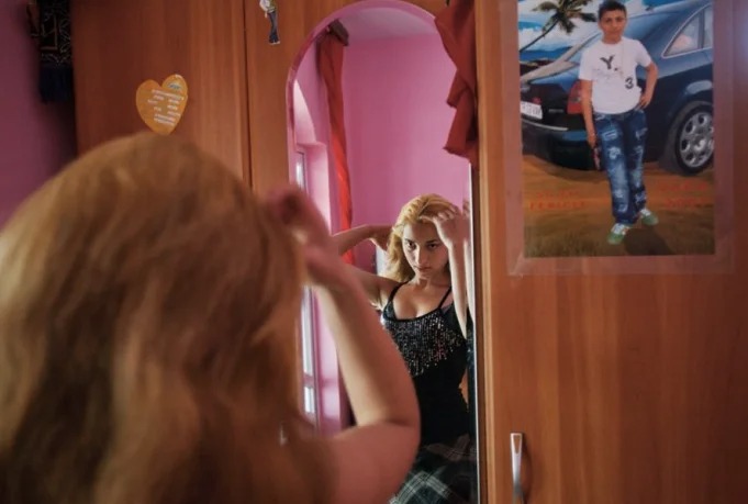 "Dəbdəbəli qaraçı evlərinin sakinləri üçün xarici görünüş çox vacibdir. Aşağıdakı fotodakı 13 yaşlı Kasi öz nişanlısı - gələcək həyat yoldaşı - 14 yaşlı Sami (şəkli şkafın qapısında asılıb) üçün bəzənir. Varlı ailələrin uşaqları arasında bu cür razılaşdırılmış nikahlar Buzeskuda hələ də çox yayqındır ".