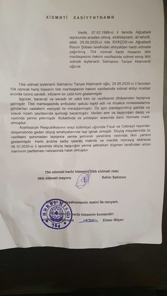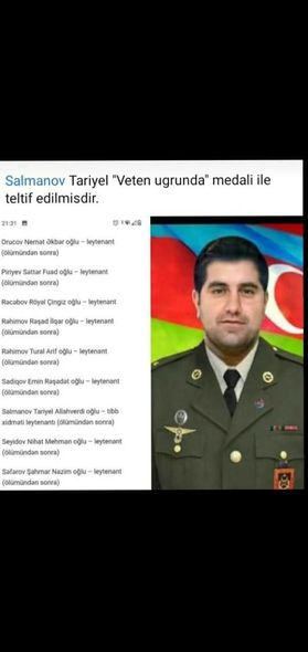 Vətən Müharibəsində qəhrəmanlıq gösətərənlərdən biri də hərbi xidmət həkimi Tariyel Salmanovdur.