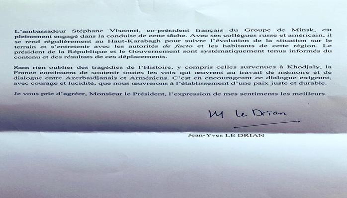 Qeyd edək ki, Fransada Azərbaycanın Dostları Assosiasiyasının (FADA) prezidenti Fransua Mansel prezident Emmanuel Makrona yazdığı məktubda Dağlıq Qarabağ münaqişəsi ilə bağlı narahatlığını bildirmiş və 1992-ci ildə Azərbaycanın Xocalı şəhərində baş vermiş soyqırımına diqqət ayırmağı tövsiyə etmişdi. E.Makron isə məktubu cavablandırmaq üçün xarici işlər naziri Jan-İv Lö Driana göndərmişdi.
