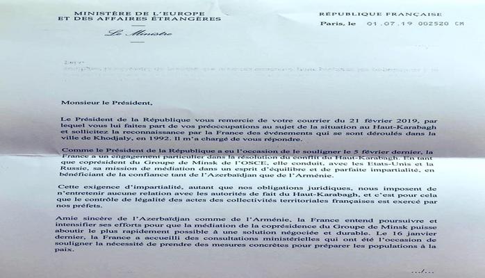 "Report"un yerli bürosu xəbər verir ki, bunu Fransanın xarici işlər naziri Jan-İv Lö Drian Fransada Azərbaycanın Dostları Assosiasiyasının (FADA) prezidenti Fransua Manselin məktubuna cavab olaraq bildirib.