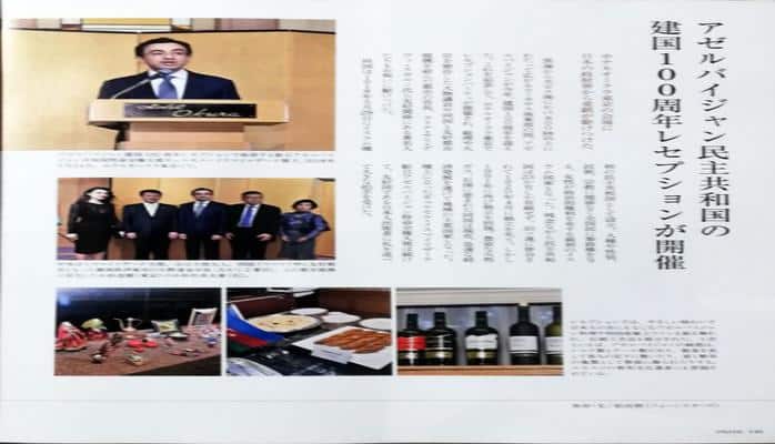 AZƏRTAC xəbər verir ki, “Azərbaycan Xalq Cümhuriyyətinin qurulmasının 100 illiyi qeyd olunub” sərlövhəli məqalənin müəllifi jurnalın baş redaktoru Akira Matsudadır. Məqalədə Azərbaycanda 28 May – Respublika Günü, Xalq Cümhuriyyətinin yaradılmasının 100 illiyi münasibətilə Tokionun “Okura” otelində mayın 24-də səfirliyimiz tərəfindən keçirilən rəsmi qəbuldan bəhs edilir.