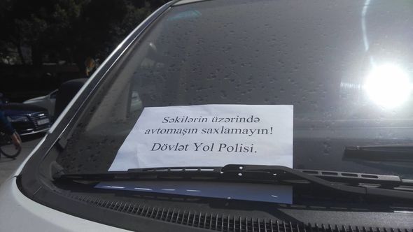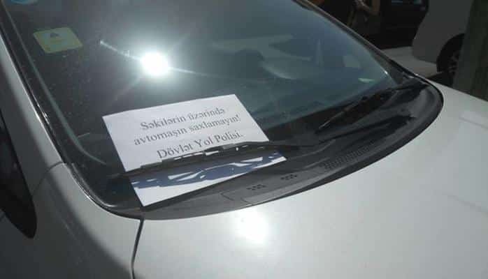 Polislər səkilərdə dayanmış avtomobillərin qabaq şüşəsinin üzərinə “Səkilərin üzərində avtomobil saxlamayın! Dövlət Yol Polisi” yazılmış vərəqələr qoyurlar.
