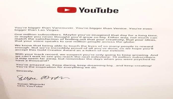“Sizin gördüyünüz işlə qürur duyuruq. Ümid edirik ki, hörmətimizin əlaməti olan Gold Creator Award-ı (Qızıl yaradıcı mükafatı) qəbul edərsiz. Növbəti mərhələ kimi 10 milyon izləyici toplamağınızı səbirsizliklə gözləyirik.