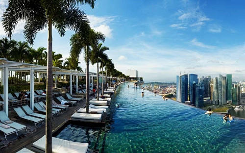 Самый высокий бассейн мира расположен на вершине отеля Marina Bay Sands Resort в Сингапуре. У огромного бассейна прозрачные бортики, поэтому кажется, что вода переливается через край двухсотметрового отеля.
