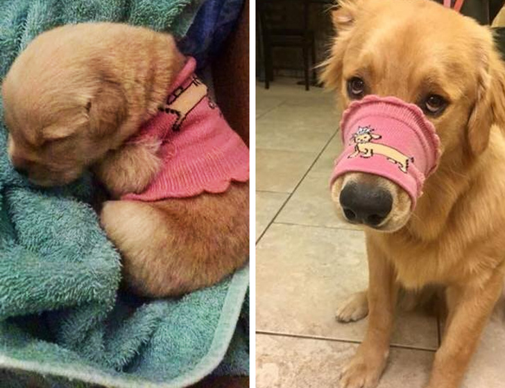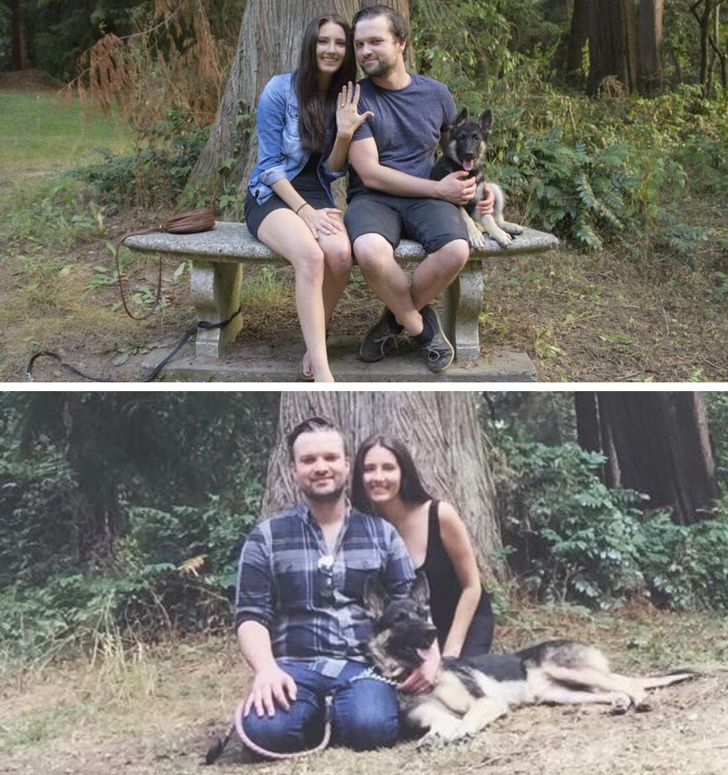 12. «Пару лет назад я сделал своей девушке предложение, подвесив кольцо щенку на ошейник. На втором фото — наша годовщина»