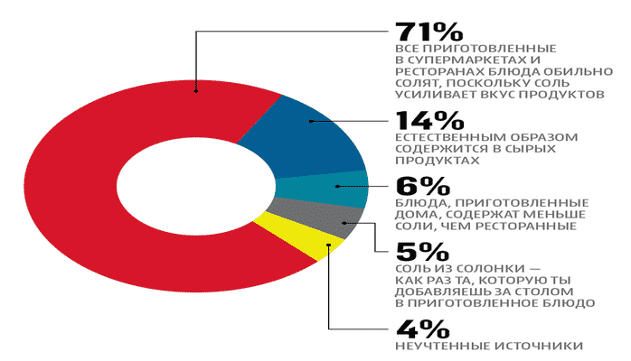 Соль берется не только из солонки: большая ее часть уже содержится в готовых и даже сырых продуктах. Так что если хочешь есть поменьше соли, придется как минимум чаще готовить самому.