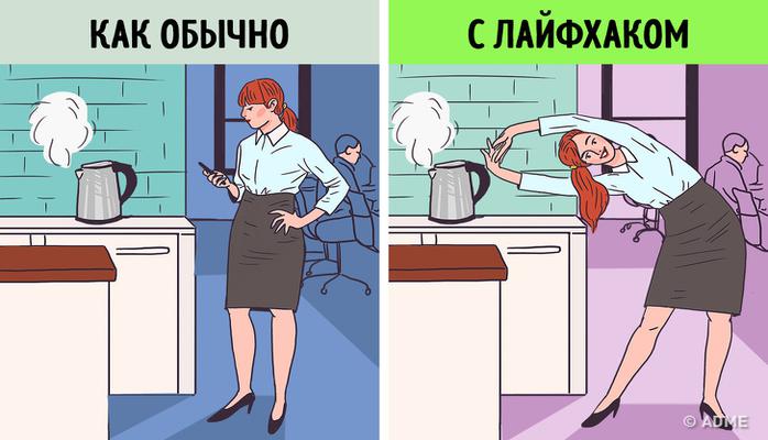 Отлучились в уборную? Выполните 10 приседаний! Пошли заваривать чай? Сделайте 10 наклонов, пока закипает вода. Если во время обеда отправляетесь в магазин или кафе, можно продолжить подсчет шагов из предыдущего пункта.