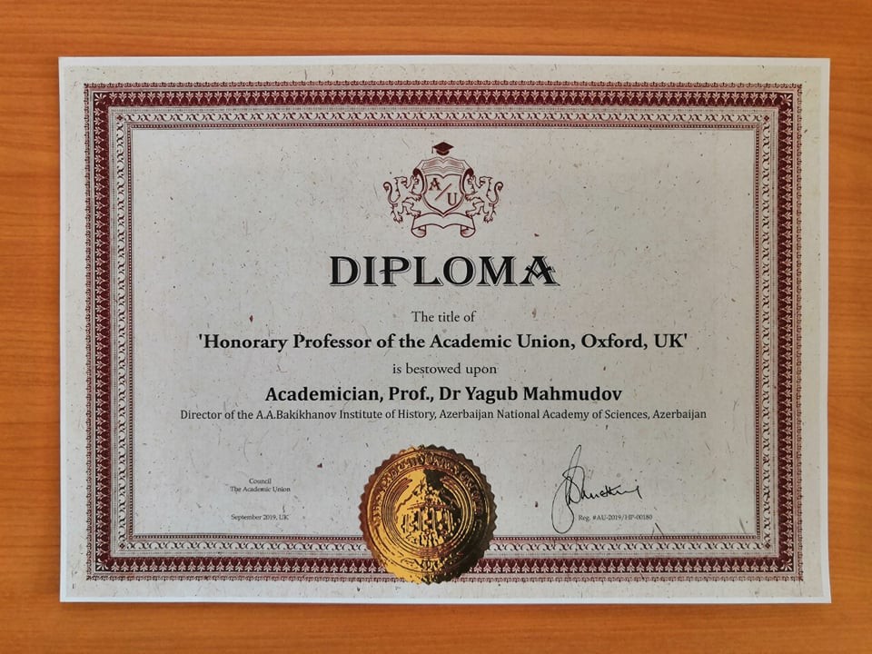 Директор Института истории Национальной академии наук Азербайджана, академик Ягуб Махмудов за профессиональные достижения в современном обществе удостоен звания почетного профессора Оксфордского академического союза Великобритании («HonoraryProfessoroftheAcademicUnion, Oxford, UK»).