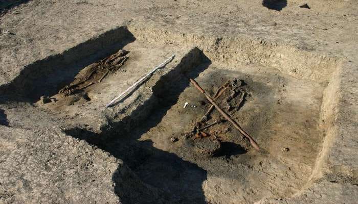 Ученые исследовали четыре хорошо оборудованных деревянных погребальных камеры в центральной части кладбища. Погребальное ложе, где находилось тело умершего, было окружено срубом из бревен и досок размером 3,5 на 2 метра и четыре могилы представляли своего рода дом. В каждой из могил были найдены останки мужчины.